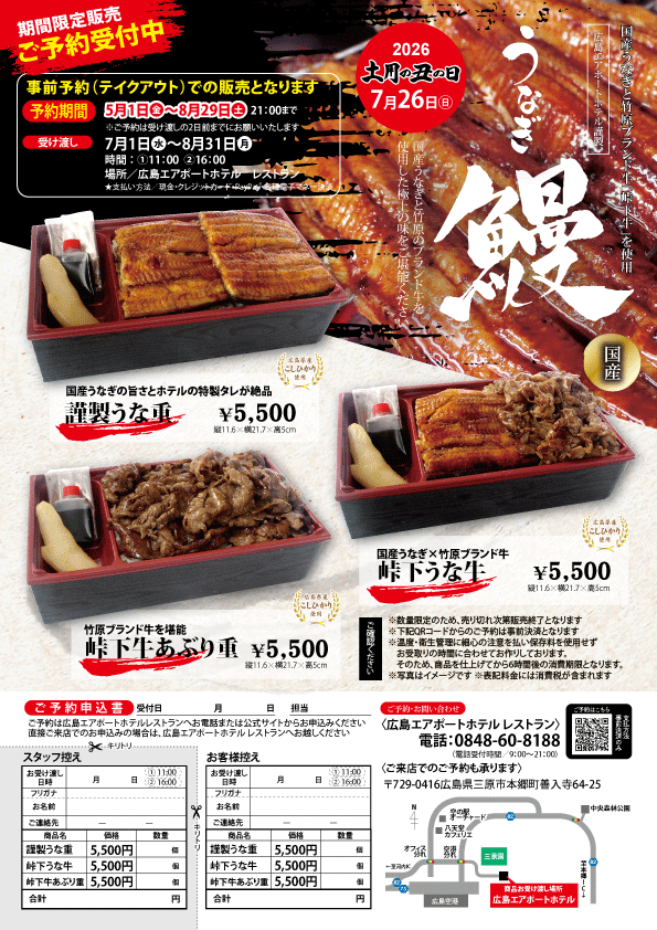 今年の夏も、土用の丑の日には広島エアポートホテルの「謹製うな重」をどうぞ。